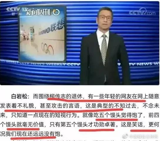 接下来再说说第三个重要的人物,他是被此次事件受牵连的人,央视名嘴白岩松先生。事件发生前期就有网友扒出来白岩松先生曾经对老柳先生退休时候的一段评价“这就是典型的不知过去,不念未来,只知道一点现在的短视行为。”