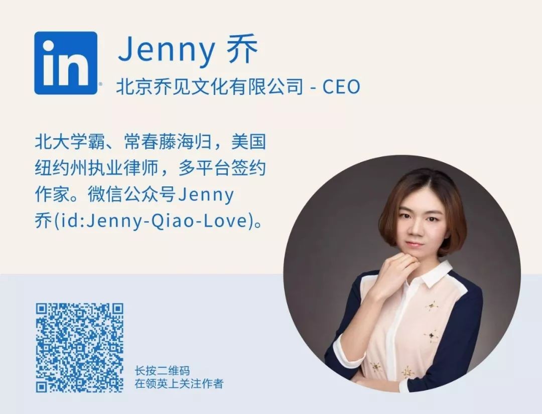 本文由LinkedIn原创,作者Jenny乔。北大学霸、常春藤海归,美国纽约州执业律师,多平台签约作家。微信公众号Jenny乔(id:Jenny-Qiao-Love)。广告发布。
