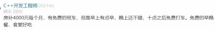一位C++开发工程师:房补4000元每个月,有免费的班车,但是早上有点早,晚上还不错,十点之后免费打车。免费的早晚餐,食堂好吃