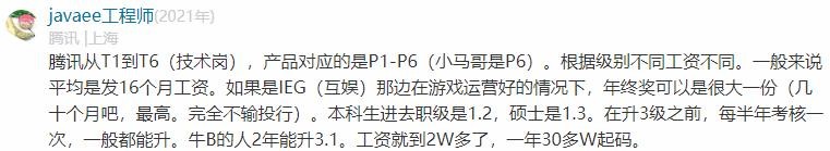 一位javaee工程师:腾讯从T1到T6(技术岗),产品对应的是P1-P6(小马哥是P6)。根据级别不同工资不同。一般来说平均是发16个月工资。如果是IEG(互娱)那边在游戏运营好的情况下,年终奖可以是很大一份(几十个月吧,最高。完全不输投行)。本科生进去职级是1.2,硕士是1.3。在升3级之前,每半年考核一次,一般都能升。牛B的人2年能升3.1。工资就到2W多了,一年30多W起码。