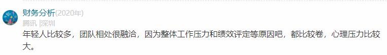 一位财务分析:年轻人比较多,团队相处很融洽,因为整体工作压力和绩效评定等原因吧,都比较卷,心理压力比较大。