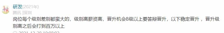 一位研发员工:岗位每个级别差别都蛮大的,级别高薪资高,晋升机会8级以上要答辩晋升,以下稳定晋升 ,晋升级别高之后会打到百万以上