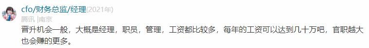 一位cfo/财务总监/经理:晋升机会一般,大概是经理,职员,管理,工资都比较多,每年的工资可以达到几十万吧,官职越大也会赚的更多。