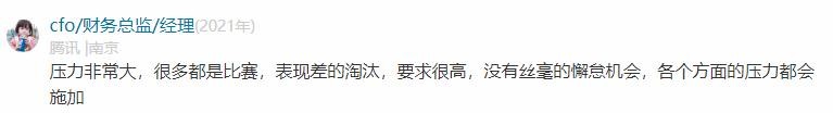 一位cfo/财务总监/经理:压力非常大,很多都是比赛,表现差的淘汰,要求很高,没有丝毫的懈怠机会,各个方面的压力都会施加