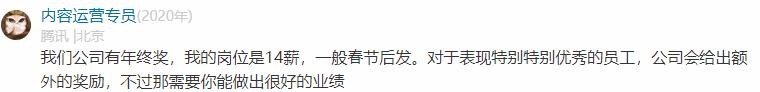 一位内容运营专员:我们公司有年终奖,我的岗位是14薪,一般春节后发。对于表现特别特别优秀的员工,公司会给出额外的奖励,不过那需要你能做出很好的业绩