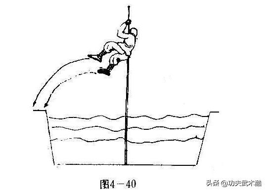 将绳一端系一铁钩,然后把钩子抛于沟上方的树枝上挂牢.再将绳向后拉成斜绳,用一臂伸直握在头部上方的吊绳上,然后向前跑一步,用脚蹬地跳起,同时用另一手握在上手的上面,成悬垂摆荡动作,向前摆时稍屈腿,摆过壕沟后,右腿向左,左腿向右,做剪绞动作,带动向左转体180度,在摆至对岸极点时放手,双脚落地,屈膝缓冲(图4-42,43,44,45)。