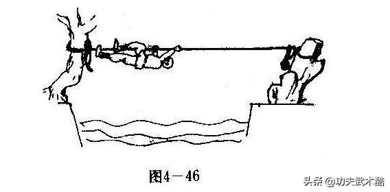 当前行途中遇一小河横拦住去路,又没有桥和船而通过。且小河对岸有石笋,身上有一长绳,可利用绳索通过小河。技法要领:站于岸边,将绳索一端系一重物,向对岸石笋抛去,让绳缠绕在石笋上缠牢后,将绳拉紧,这端系于树桩上。然后在绳下背对对岸站立,一手在前,一手在后,握住横绳。以后手同侧的膝窝挂在绳上,成手膝并用的悬垂姿势,然后后手向前手的前面换握,同时腿也换成另一膝挂绳,如此轮流向对岸移动〔图4一46)。
