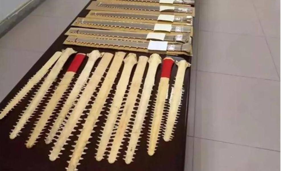 另一方面,锯鳐的锯齿嘴长相奇特,人们倾向于把它们的牙齿做成鲨鱼骨状的纪念商品出售,甚至炒到了上万元的天价。