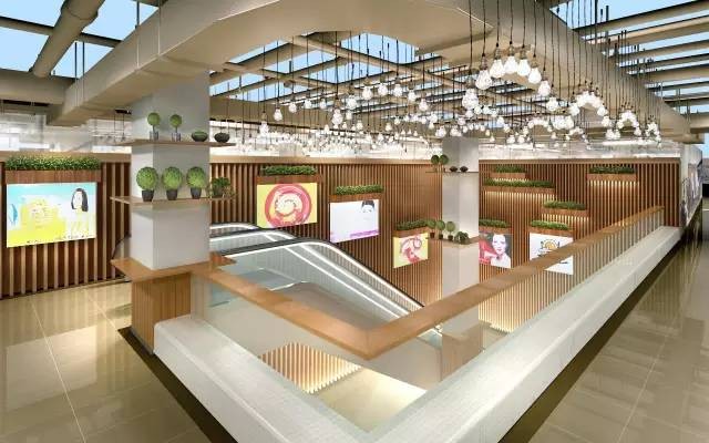 B1B2层的人流交汇处,满足人文需求考虑,采用多点光源的形式增加整个区域的照明亮度。墙面的广告牌及绿色盆栽设置同时满足绿色理念和品牌宣传的需求。逛街的你可以很方便的在这里歇脚阅读、网上冲浪。