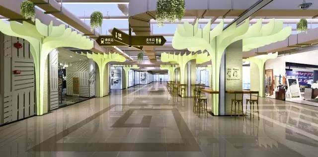 碶闸街汇入东鼓道,形成地下空间重要的十字街区,人流量极大,也是未来商业活动频繁的区域之一。抽象造型的绿树、LED灯光及天蓝色涂料营造的天空效果,都将展现在这里。让穿行在地下空间也能感受蓝天与绿树打造的开阔天地。