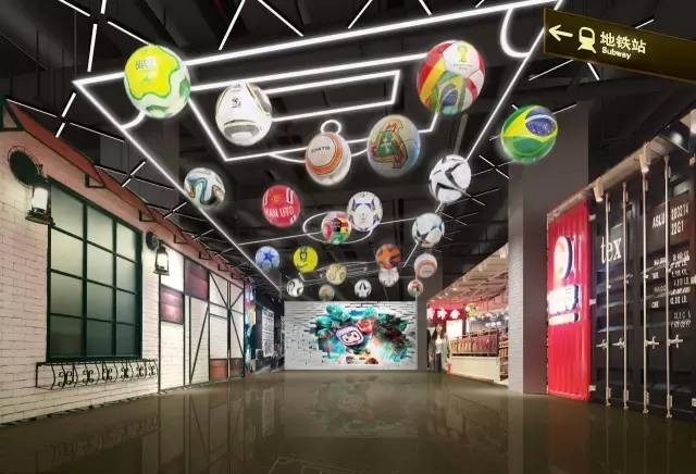为突显两大主力业态美食广场与运动集合店,大胆地将美国的街头文化引入地下室内空间。一些涂鸦、集装箱,包括吊顶上的各种球类和球场的布置,在于弱化室内外空间的区别。年轻人身处这样的环境下能感受到更加亲近的感觉。