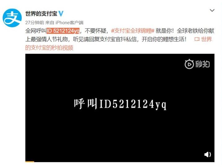 2月14日,支付宝全球锦鲤正式开奖,成为全球锦鲤的抖音ID为“5212124yq”。 据了解这位锦鲤来自中国宁波,目前仅发布了唯一一条抖音,内容是一只鼠标,运气真是爆棚!有网民调侃:我败给了一只鼠标。
