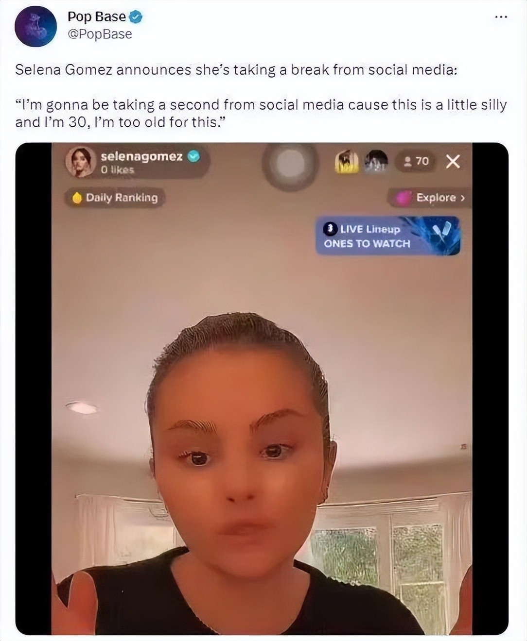 前段时间,赛琳娜在直播时提到自己将要离开社交媒体一段时间,她说:“我要从社交媒体上花点时间,因为这有点傻,我 30 岁了,不适宜再花费那么多时间在这上面了。很爱你们大家!我很快会跟大家重新见面,只是我需要一段时间休息,远离一切。”
