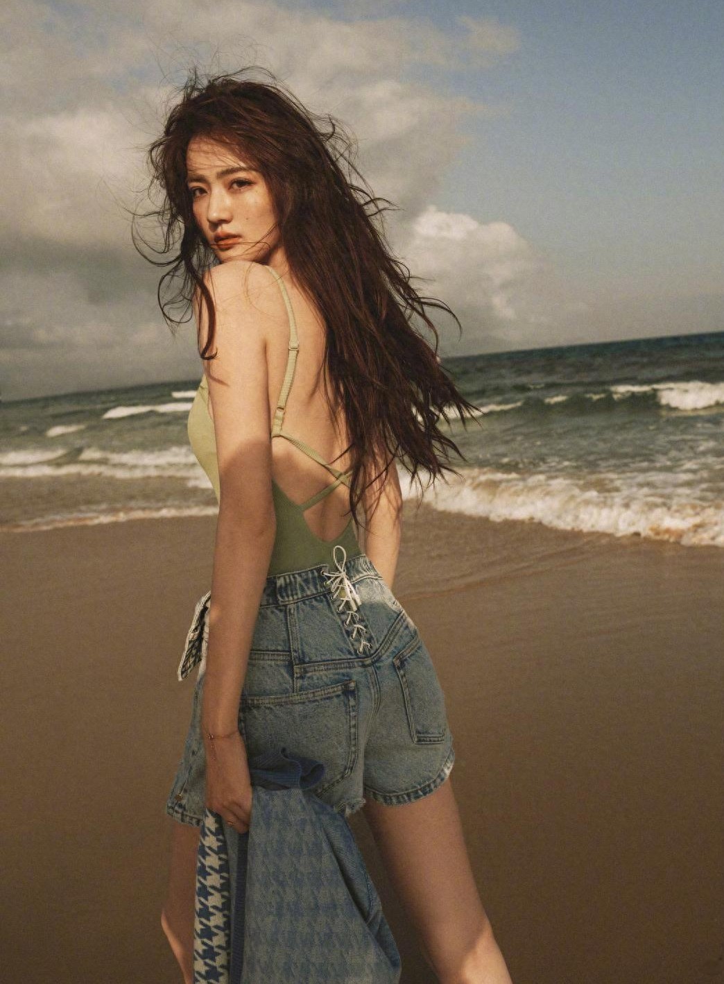 在海边,徐璐身穿露背装搭配牛仔超短裤,留着长发及腰的头发,回过头看镜头,十分迷人!一双大长腿又细又白,大秀诱人香肩,整个人散发着独特魅力气息!