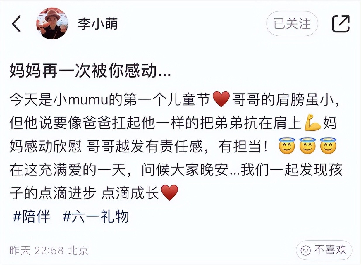 值得一提的是,在此次分享中,对于迎来第一个儿童节的二宝,李小萌还首次曝光了二胎儿子的名字,叫小mumu,很好听的一个名字哦。