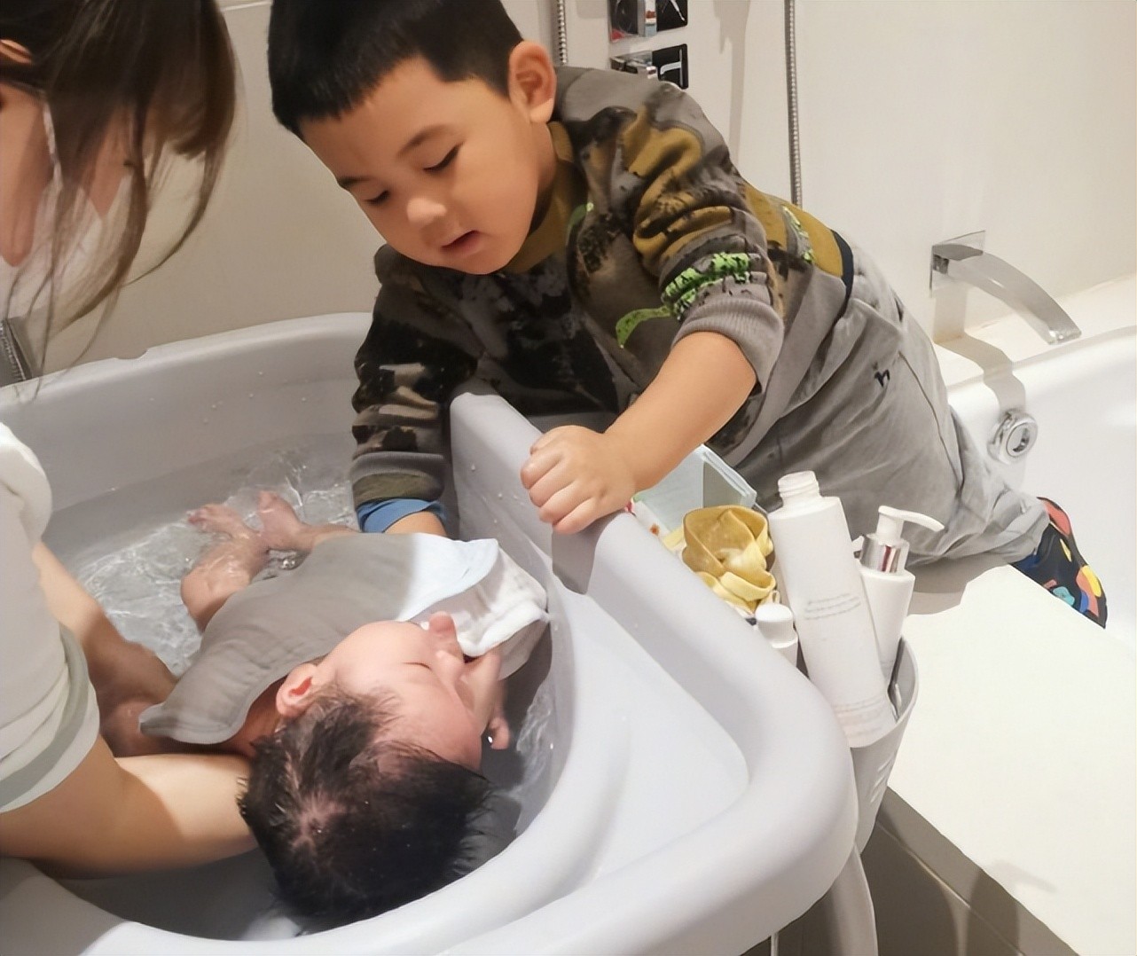 从二宝出生到现在, 身为哥哥的Raymond不仅没有和弟弟争宠,而且,还帮着爸爸妈妈一起给弟弟洗澡照顾弟弟,兄弟情深。