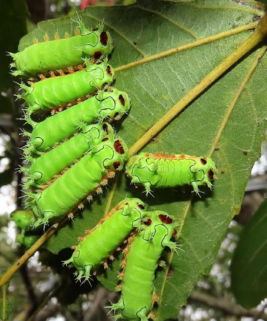 08.一大群刺蛾的幼虫正在分食一片树叶,队列排得非常整齐,身上的刺让人看了以后胆战心惊。