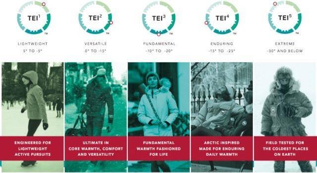 加拿大鹅专门开发出了一套“TEI”体系,全名是Thermal Experience Index,体感温度指南,TEI指数越高,就说明衣服的耐寒能力越强。这套体系是专门用来说明某一款衣服适合在什么温度跟场合下穿,让消费者更方便地根据生活环境与喜好选出适合自己的衣服款式。