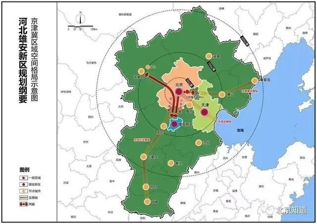 再有,雄安新区启动区距离北京和天津分别110公里,恰与北京构成等边三角形,京津雄形成“三足鼎立”之势。