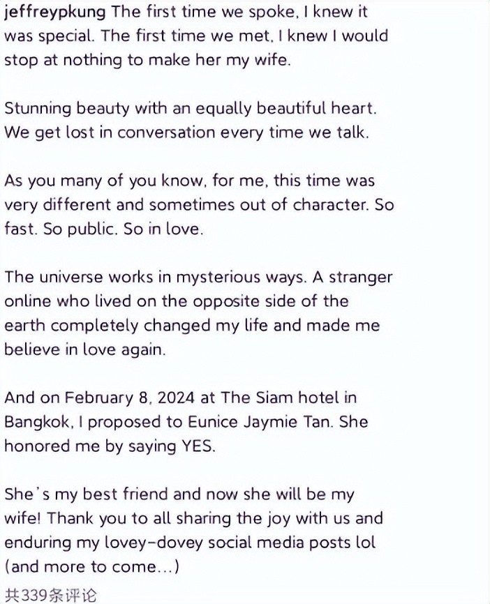 照片中,未婚妻Eunice Jaymie Tan与他十分登对,宛如天作之合。孔令奇把一个4克拉的大钻戒套到了未婚妻的手指上,不由得笑了又笑。