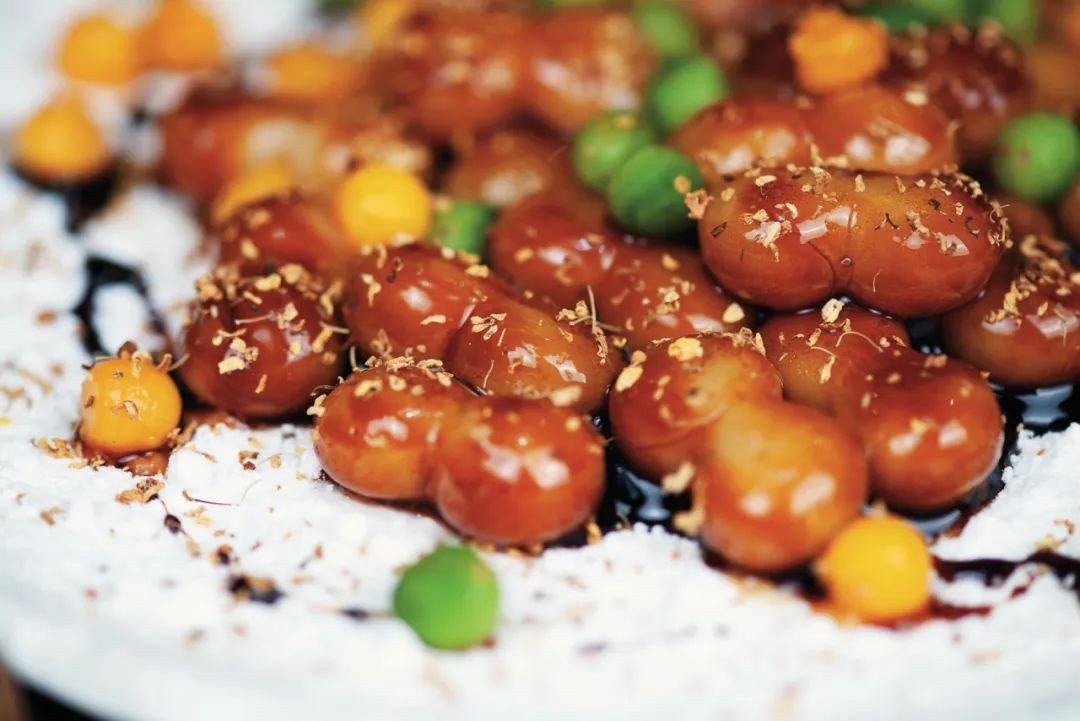 “自己动手,丰衣足食。”这句话给了我们灵感,那怎么能让宾客好友们来品韩家菜时践行这句至理名言呢?于是美林便亲自设计制作了内带瓦楞的钧瓷小碗,里面装上黑芝麻和红糖,配上一根手掌长度的圆头花椒木杆,锅里煮上团团圆圆、香甜软糯的汤圆,这道“互动式”的甜品就完成了。