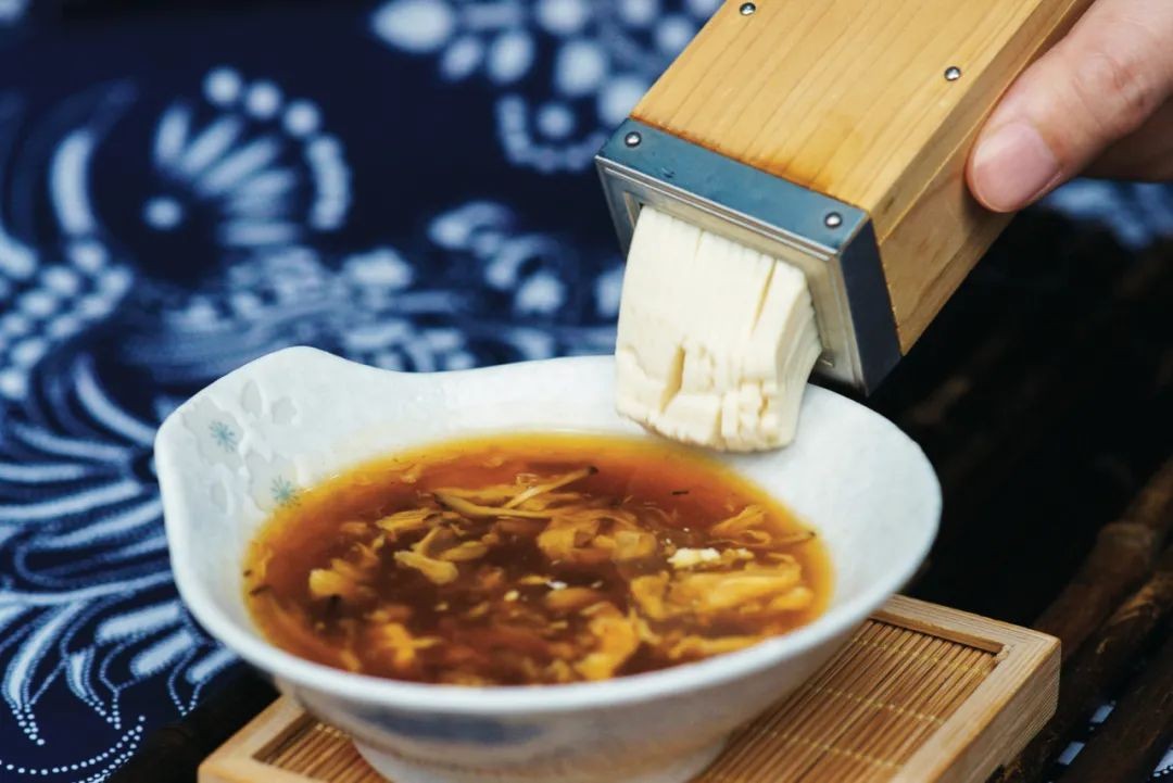 在日本偶然看到的这个木质容器,解决了美林先前对家里酸辣汤不满意的地方,那便是豆腐因入锅时间长而太老。这个大家美其名曰“豆腐枪”的到来,解决了这个难题,把嫩豆腐切块后塞进“豆腐枪”,直接推入热腾腾的酸辣汤碗里,豆腐被自动切成一个个细条,细腻爽滑的豆腐撞上浓郁且滚烫的汤汁,世界上完美的酸辣汤就此诞生。