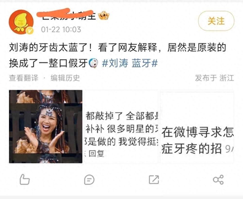 1月22日,网络上流传一位娱乐博主发表文章,针对圈内知名女星刘涛的烤瓷牙提出略显特别的看法,即其牙齿颜色有些偏蓝,因此引起了广大网民的关注和热烈讨论。