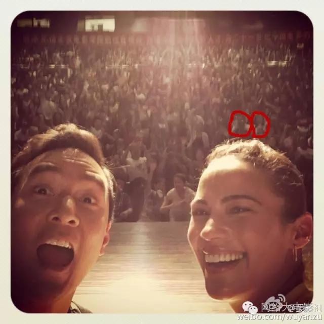 这张照片是男神吴彦祖自拍发到他微博上的,两位小编的位置如果所示,嘿嘿,是不是只看见模糊的两坨人影?看不清就去怪吴彦祖老公的手机像素吧!
