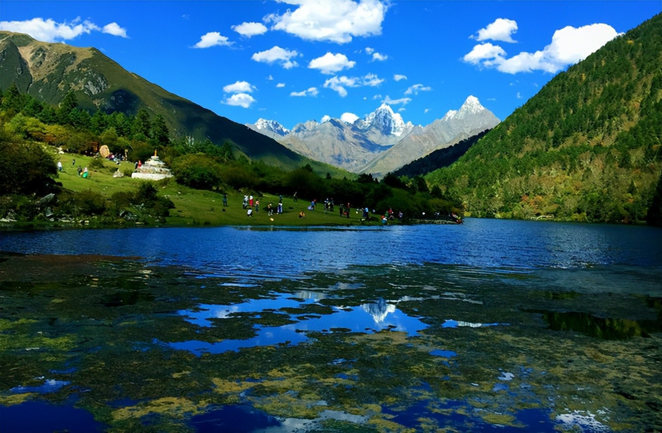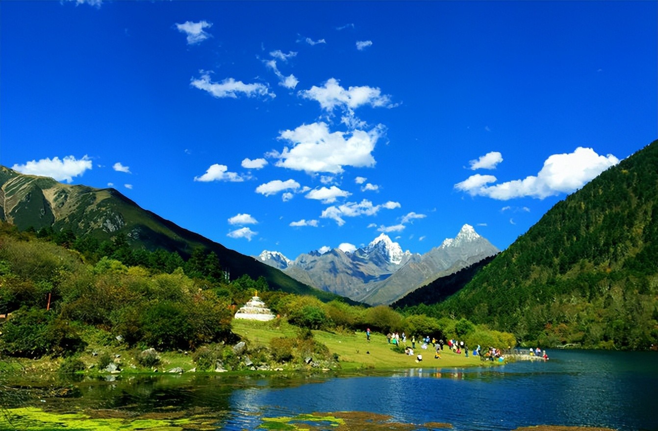 木格措坐落于贡嘎山脉中段,距康定城约17公里,由黄金海岸、白海草原、溜溜山、七色海、药池沸泉等景点组成,附近有多个高山湖泊和温泉,其原始森林、草原和雪山景观互相交融。