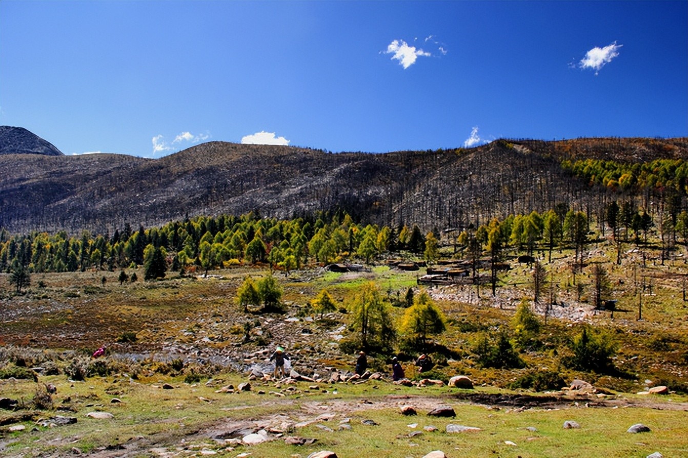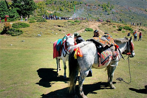 白海草原,在这里有祈祷的美丽经幡、承载无数春秋的玛尼堆,虽然自己不懂这些深层次的含义但每次都会被人们的虔诚或信仰所打动,记得之前曾听藏家人说:经幡作为福运升腾的象征物每年都要换新,换新的日子不能随意选择,它是根据藏族历算,选择在藏历新年初一过后某一个良辰吉日。这一天早上,全院的人都穿上节日盛装,聚集在楼顶上,举行一次隆重而欢乐的插经幡仪式,藏语里这个仪式称为“托随”,意为祭神祈福仪式。而玛尼堆玛尼堆没有固定的形状,呈方形或椭圆形,也有墙形或塔状的。它们都有一个正面,通常向东,因为面朝太阳象征着吉祥......本以为只有深秋时银杏树叶的金黄非常的美丽,没想到在这却有如此惊艳的金黄的松树叶;草原经幡旁有臧家牦牛肉可谓色香味俱全,2元每串有时间或此爱好的可以尝尝。