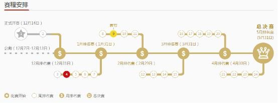 “金凤凰”贵金属模拟交易大赛于2015年12月14日正式开始,以周为单位,历时6个月,设周奖、月奖、终极大奖百万奖金激励投资者。比赛期间,金道贵金属每周、每月将会从参赛者中选出收益率排名前五名的参赛者获得周奖、月奖,最后总决赛会选出收益率排名前三名的参赛者获得奖金,金道贵金属将会在每周、每月及总决赛结束后分别公布获奖者名单。具体赛程安排如下: