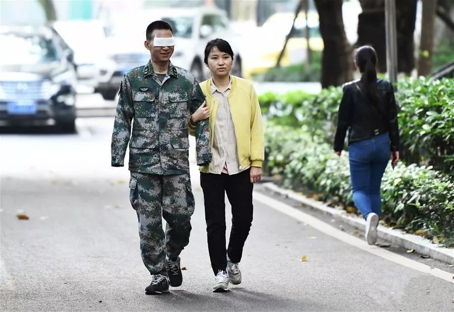 在陆军军医大学,杜富国与妻子王静一起散步(4月15日摄)。新华社记者 张永进 摄
