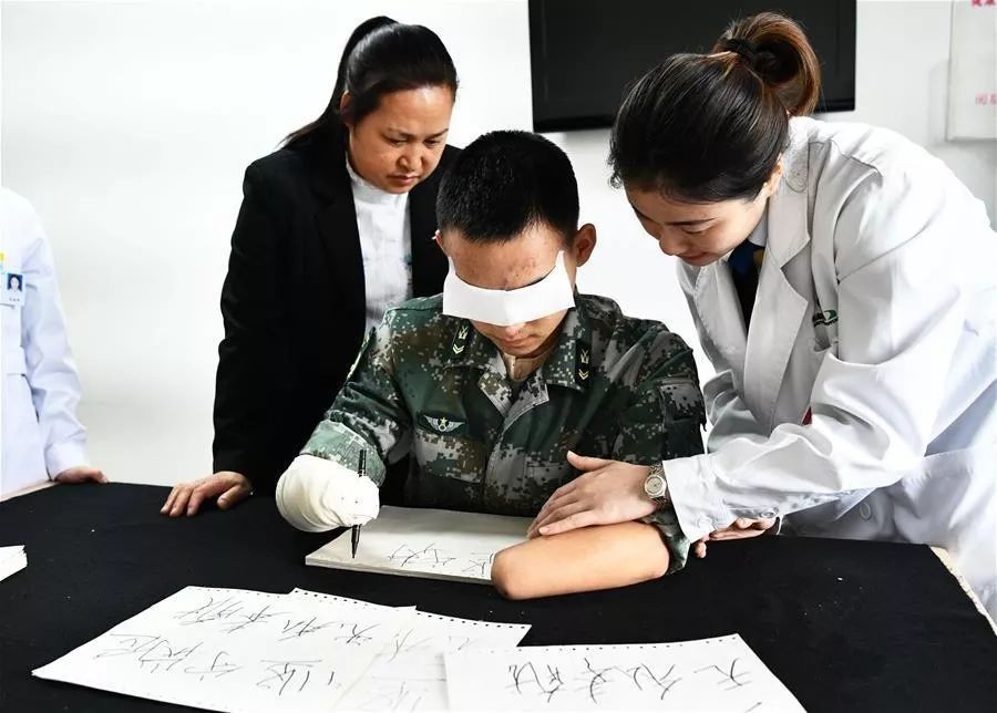在陆军军医大学康复中心,杜富国(中)在练习写字(4月15日摄)。新华社记者 张永进 摄
