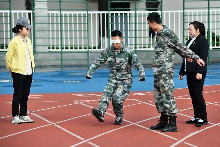 在陆军军医大学操场上,杜富国(左二)在家人和战友的陪伴下进行下肢力量康复训练(4月15日摄)。新华社记者 张永进 摄