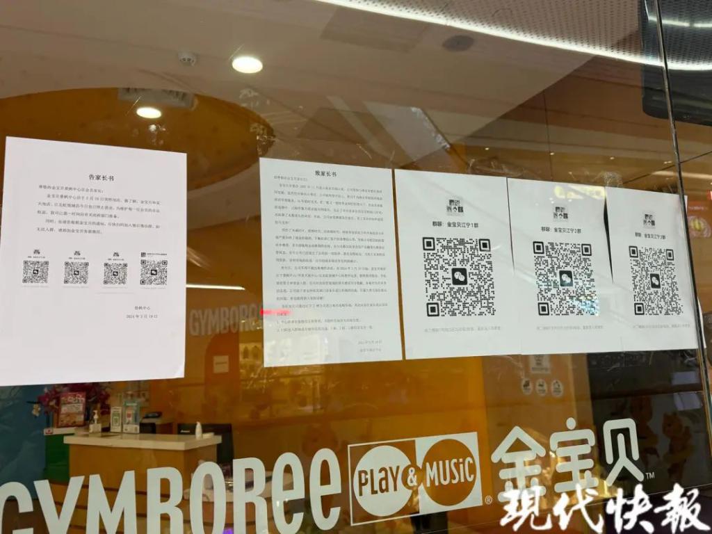 据现代快报报道,3 月 20 日,记者来到金宝贝南京江宁景枫中心店和华采天地中心店。记者发现两店情况一致,大门上了锁,店内还留有一些物品,玻璃门上贴着《致家长书》,落款时间为 3 月 18 日。此外,玻璃门上还贴着 3 — 4 个群二维码,提示让消费者扫码进群协商。