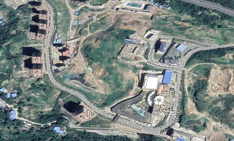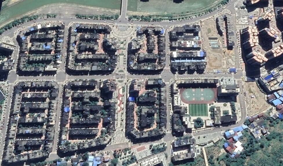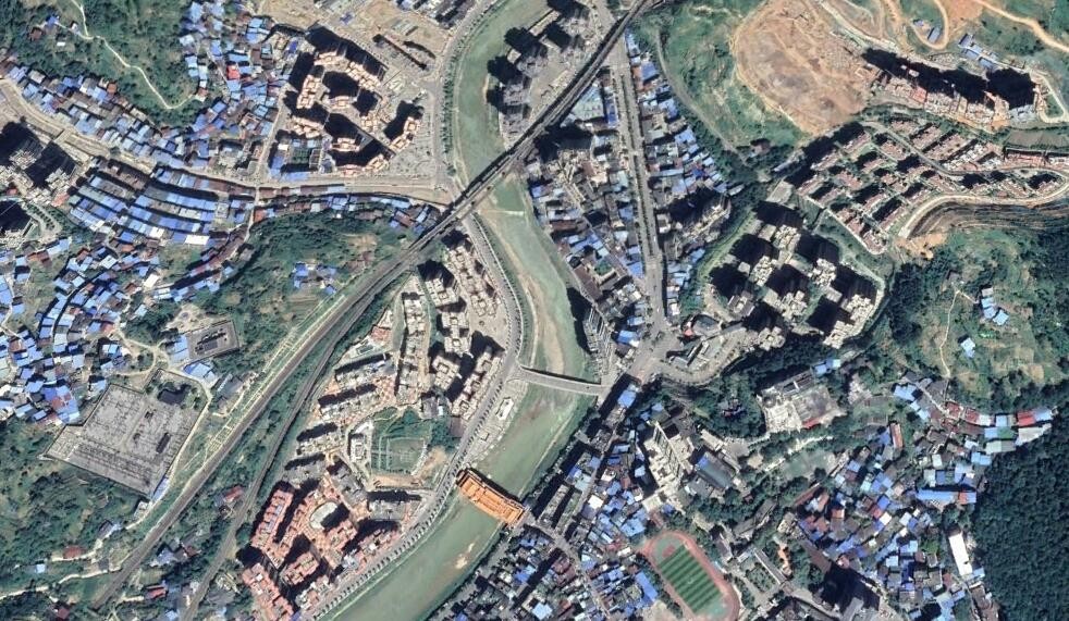卫星上看四川万源市:一座小山城,城内有很多蓝色屋顶