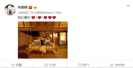 10月8日,何雯娜通过公众平台晒出一张美照。照片中的她穿着黑色的宽松上衣,白色的纱裙端坐着,看上去非常温婉。她还配文:"我们爱你。"并发了两个心相加等于三颗心,意指爱情结晶的到来。