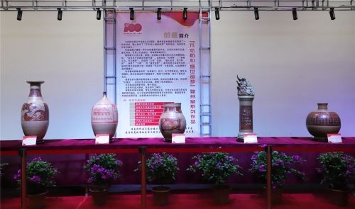 据悉,很多作品都融入了共产党党史中重要事件、重要标语等元素创作而成。譬如由金华市非物质文化保护协会会长、金华市婺州窑陶瓷研究所研究员陈三富创作的作品,以浅浮雕工艺烙刻了“真理的味道是甜的”“星星之火可以燎原”等红色征程中的经典语录,讲述中国共产党于百年间各阶段的标志性历程。另外,此次展览涵盖婺窑代表性器型、釉色、装饰手法,大小规格错落,于古朴中讲述婺窑的千年文明、红色百年的漫道征程。