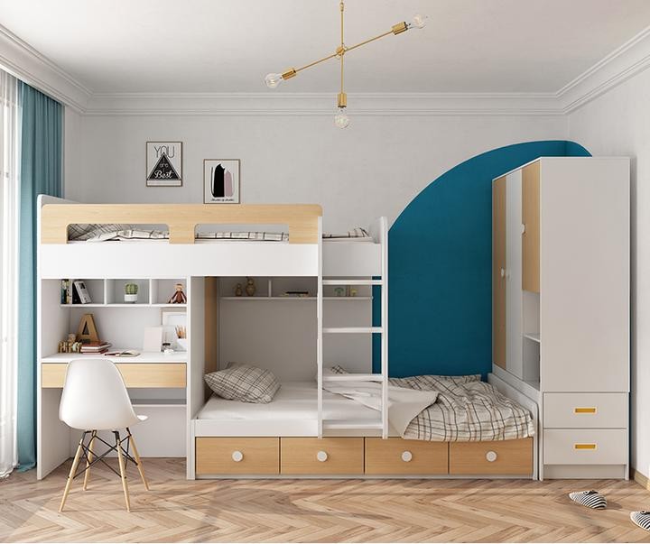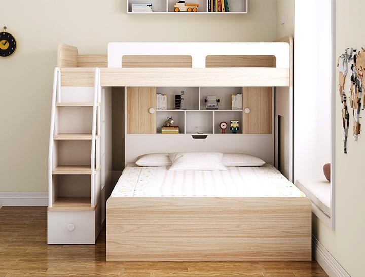 不管是让木工自己手打高低床,还是选择成品的高低床,值得注意的是上床的围栏的高度一定是加高加厚的挡板,要保证孩子睡觉不老实,也不会因此掉下床。