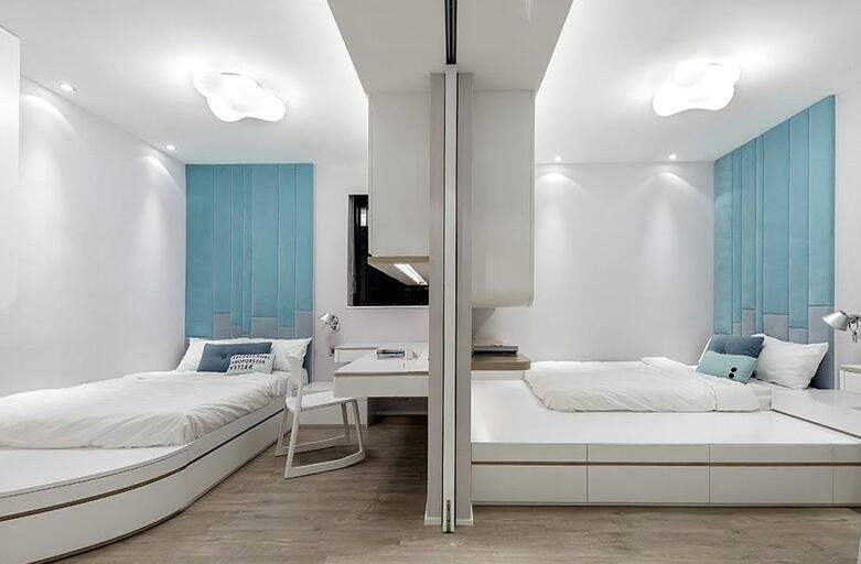 或者可以在两床中间装一个隔板推拉门,俩人在睡觉的时候拉出来,学习玩耍时就关起来,自然就形成了两个单独的私密空间。