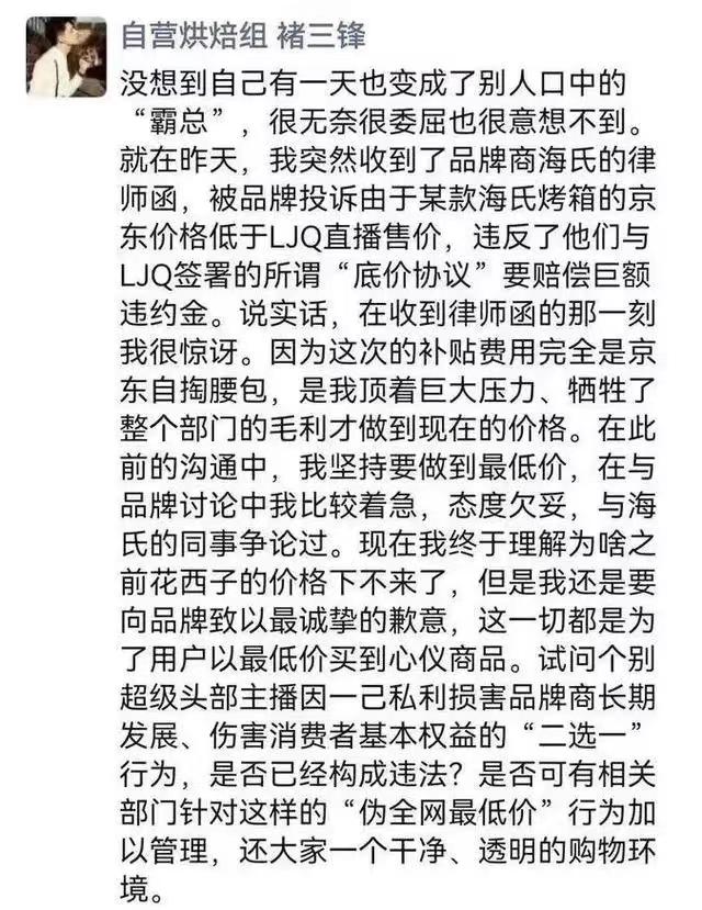 10 月 24 日,京东采销人员在朋友圈公开喊话李佳琦 " 二选一 " 该人员称京东收到了品牌商海氏的律师函,被海氏投诉由于京东自营店中某款海氏烤箱的价格低于李佳琦直播间售价,违反了他们与李佳琦签署的 " 底价协议 ",并要求赔偿巨额违约金。该京东工作人员表示,产品为京东自营产品,其价格低是因为京东自掏腰包进行了补贴。