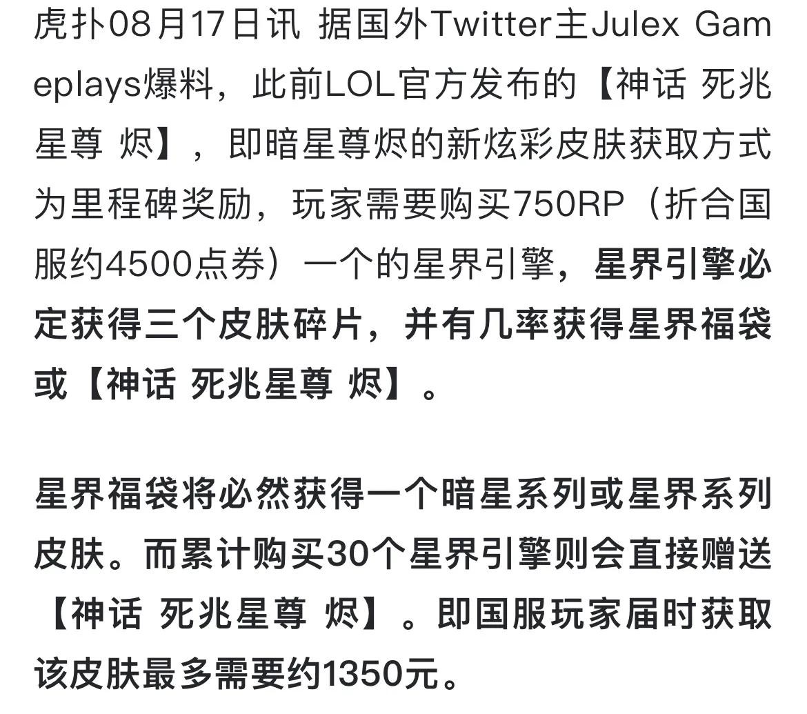 最近国外的玩家爆料,这一次神话皮肤的价格非常的高,获取方式也有了一定的调整,需要用里程碑奖励的方式获取,玩家购买750rp,折合国服点卷为4500点卷的一个星界引擎,星界引擎必定获得三个皮肤碎片,并有几率获得星界福袋或者是神话进的皮肤。星界福袋必定获得一个暗星系列或者是星界系列的皮肤,而累计购买30个星界引擎则会直接赠送神话进的皮肤,即国服玩家需要该皮肤最多花费大概在1350左右。