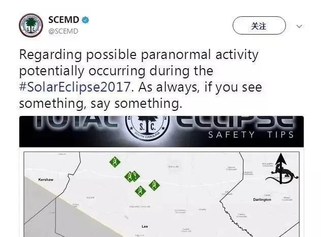 “我们不确定蜥蜴人在日食期间,会不会变得格外活跃,还是提醒黎郡和萨姆特郡的居民们,请保持警戒。”这段看起来很玄幻的呼吁并非出自廉价科幻小说,而是美国南卡罗来纳州政府“紧急应变部门”在推特发布的官方讯息。