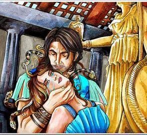 美杜莎跑到雅典娜的神庙,这是她唯一感到安全的地方,但被欲望吞噬的波塞冬追上了年轻女子。