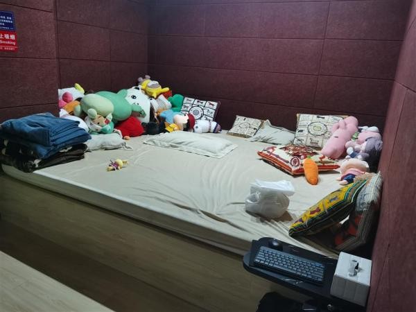 一家非法点播影院里,影厅大床上杂乱地堆放着玩偶。 钟菡 摄