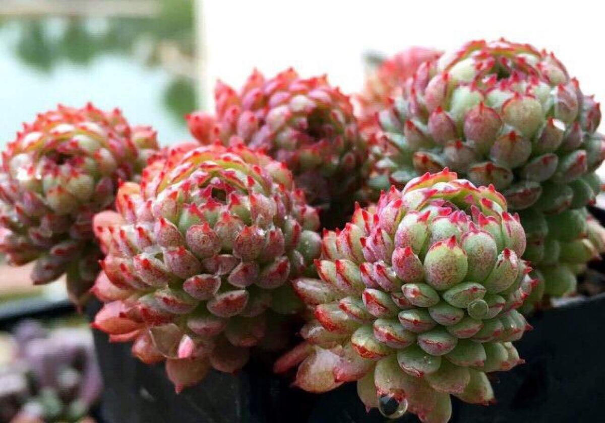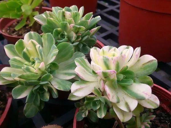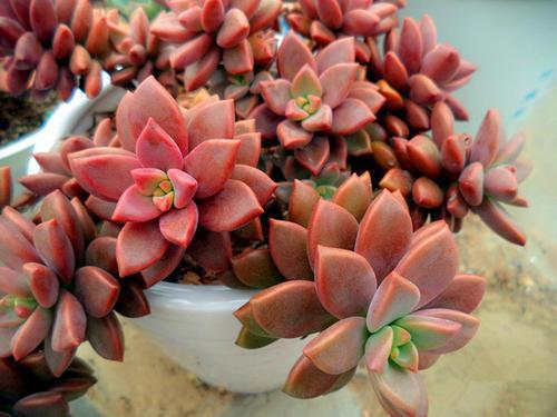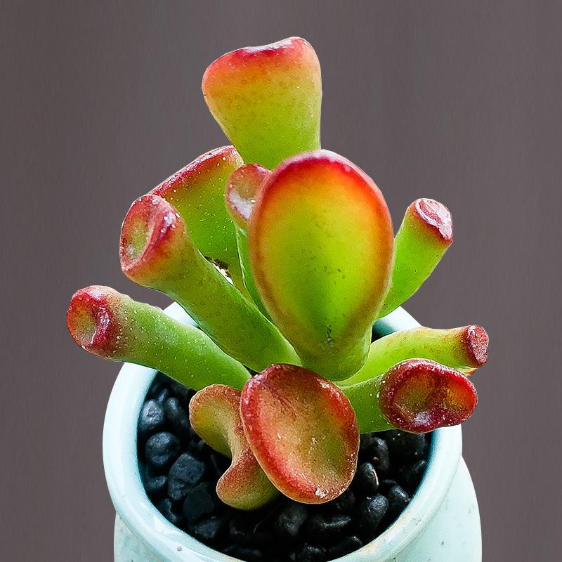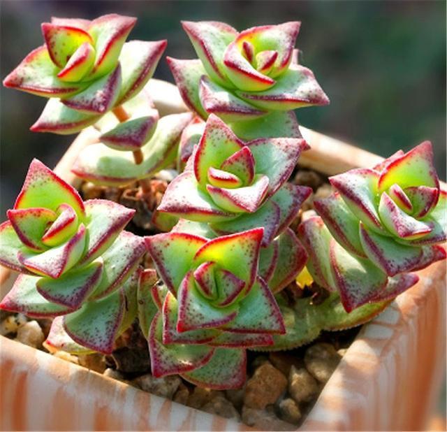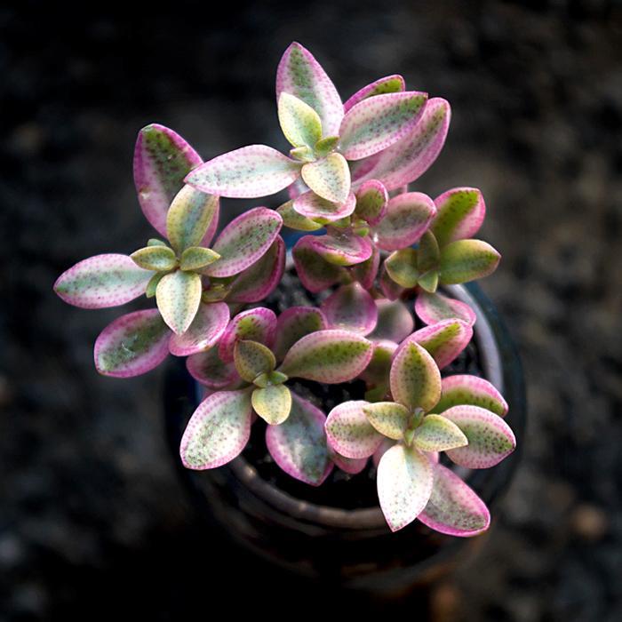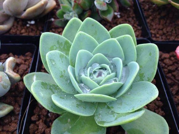叶片呈灰绿色,叶面上有一层淡蓝色的霜粉,在阳光充足,有一定温差的环境下会变成粉红色。少见的可水培多肉。