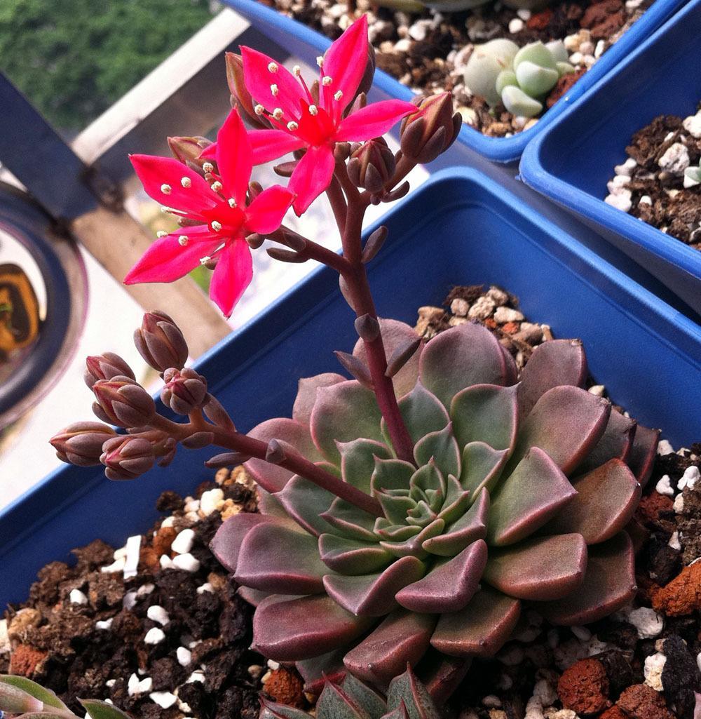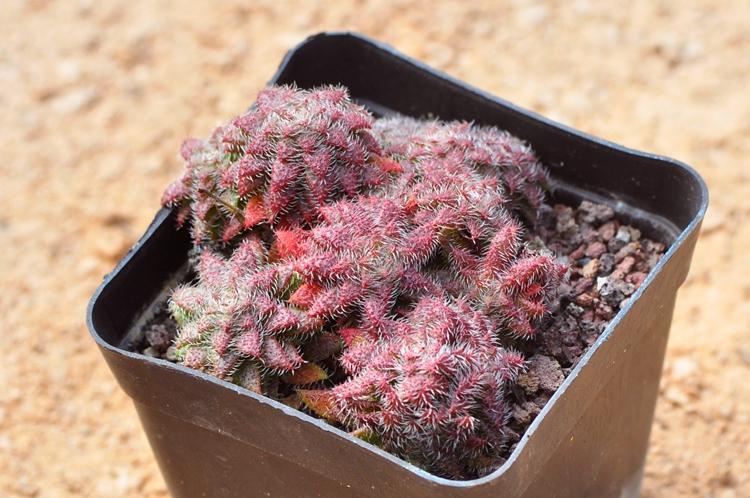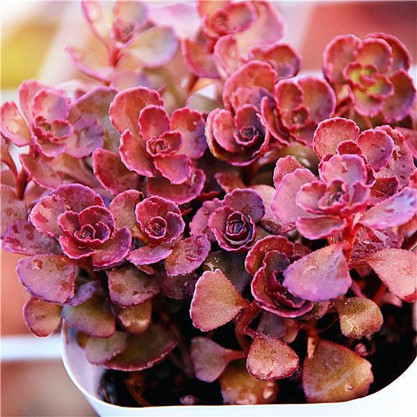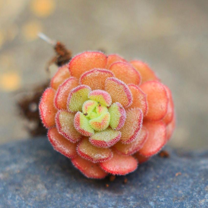 株形和石莲花属极为相似,叶色朱红带褐色,叶片呈瓜子型,上有白粉,叶末较尖有须,开黄色小花,星状。