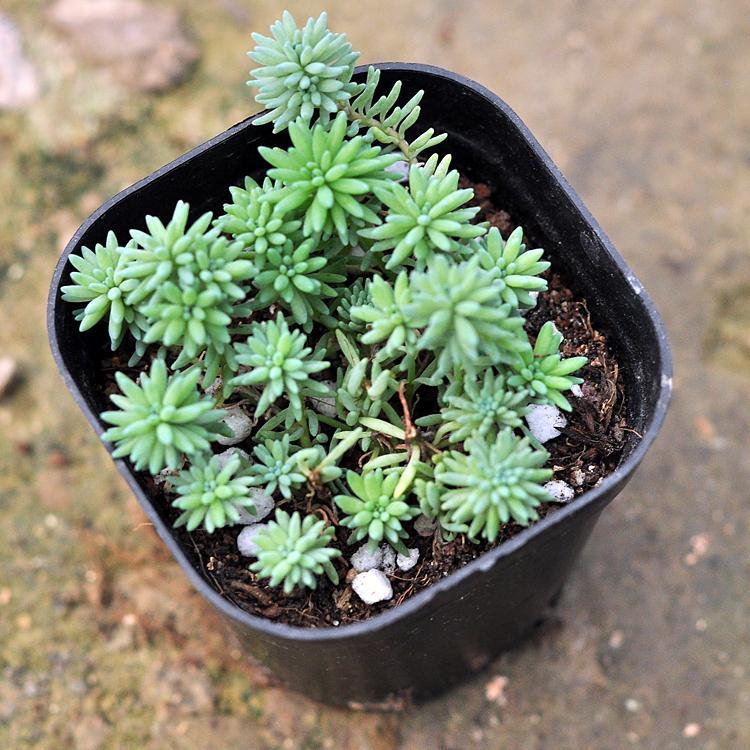 叶棒状蓝灰色,密集生长在茎端,表面覆有白蜡粉,冬季叶色濡染紫红色调,喜欢阳光充足的环境,全日照下可以保持叶形的紧凑,叶片也会慢慢转为蓝粉色。茎匍匐生长,接触地面容易生长不定根。