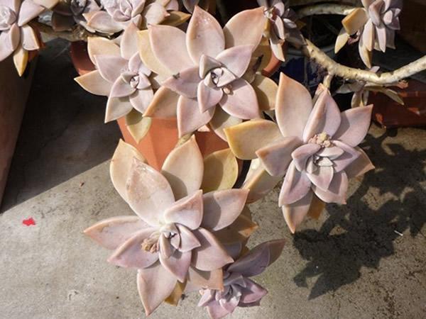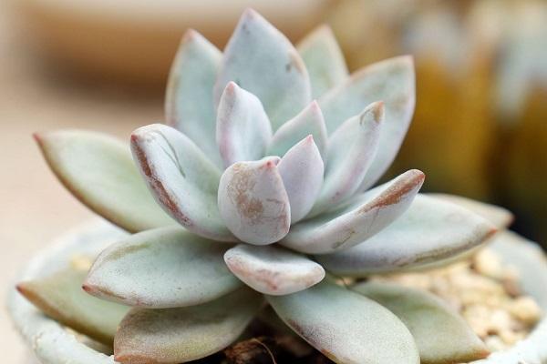 叶片稍薄为灰蓝色(温差大、日照时间长的环境下叶片会变为淡粉色),叶前端稍尖,叶片表面有一层白霜,日常浇水时需注意勿将白霜冲刷掉。