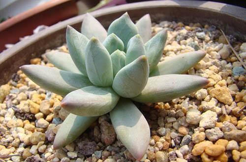 叶片匙形,叶端有尖,叶片比蓝石莲要平整厚实,幼株的叶片有一层薄薄的白粉,老株上没有。